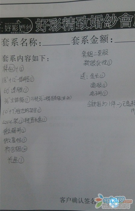 正文摘要:人于8月14號在好彩婚紗攝影約定了一套婚紗照原價5999元(惠州奧地利小鎮(zhèn)攝影基地3套衣服+仁化好彩專用奧斯卡攝影基地3套衣服)。 和店員協(xié)商后優(yōu)惠價為5299元,另外贈送一套全新婚紗。   ... |